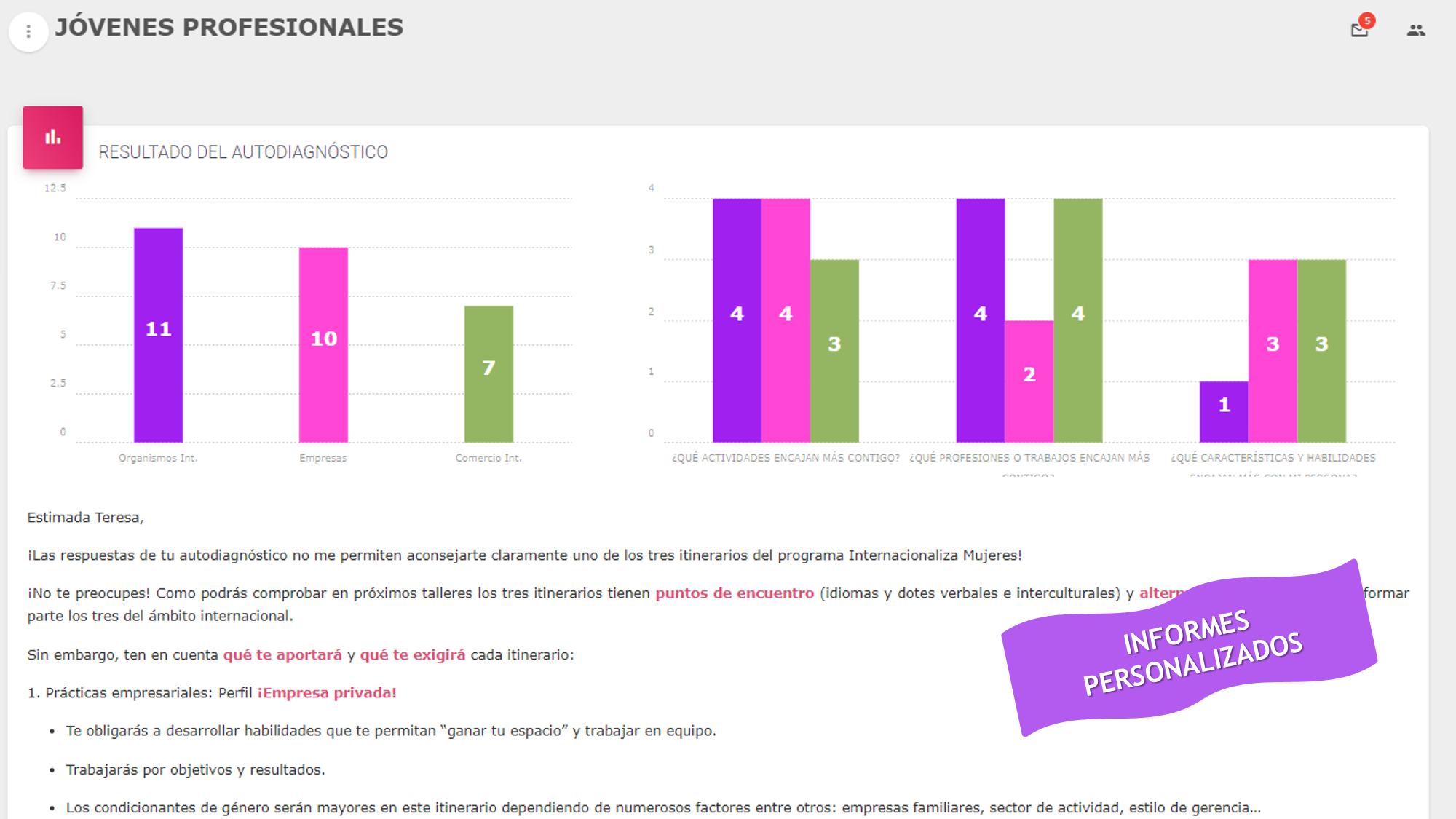 • Perfil jóvenes profesionales. Se les ofrece también interesantes materiales con tips y guías para facilitarles el acceso laboral a cada uno de los tres itinerarios definidos: comercio internacional, empresas y organismos internacionales.  También tienen disponible la herramienta Autodiagnóstico, el que tras su realización les ofrecerá resultados personalizados y gráficas indicadoras del itinerario más adecuado para cada una de ellas.